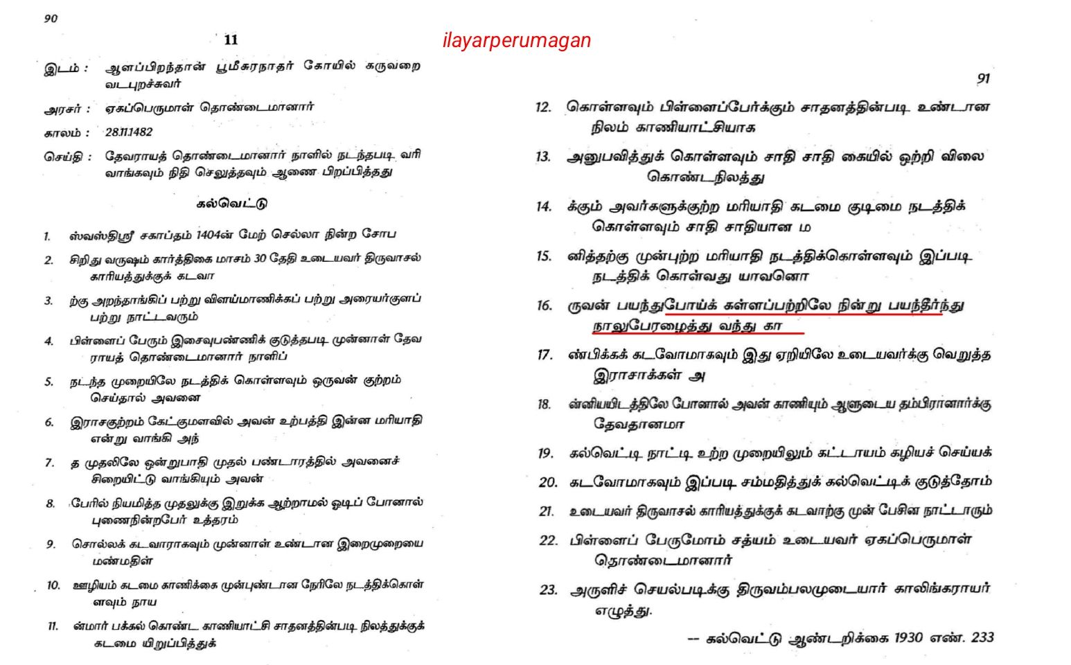 கிபி 1482 ஆம் ஆண்டு கடவுளின் சாட்சியாக அறந்தாங்கிப்பற்று, விளய்மாணிக்கப்பற்று, அரையர்குளப்பற்று ஆகிய ஊர்களை சேர்ந்த நாட்டவரும் , பிள்ளை பேர் எனும் அரச குடும்பத்தினர் இசைந்து கொடுத்தது யாதெனில்:-