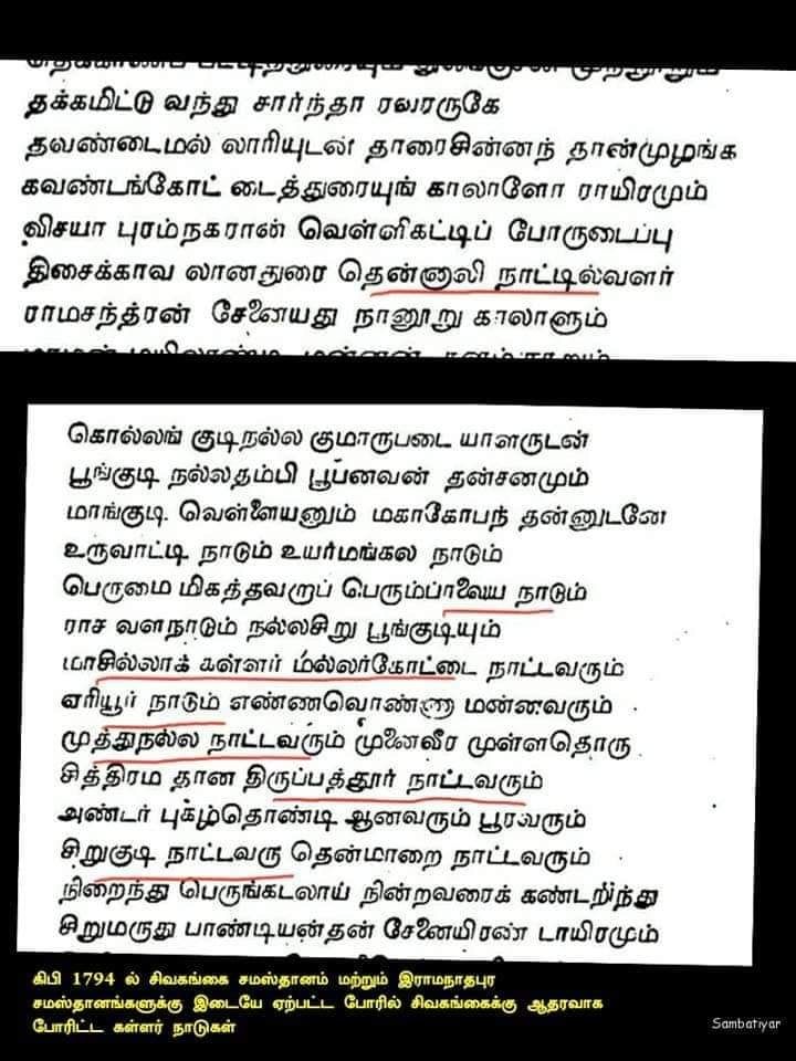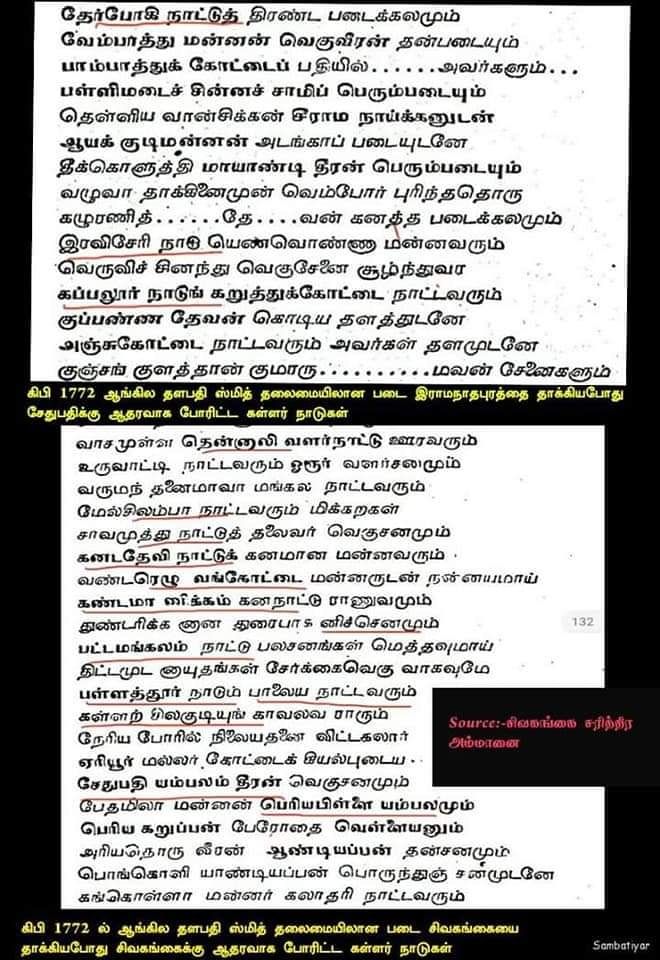 “கண்டதேவி நாட்டு கனமான மன்னவரும் வண்டரெழுவங்கோட்டை மன்னருடன் கண்டமாணிக்கம் கனநாட்டு இராணுவமும் துண்டரிக்க னான துரை பாகனிச் சனமும் பட்டமங்கல நாட்டு பலசனங்கள் மெத்தவுமாய் திட்டமுட னாயுதங்கள் சேர்க்கை வெகு வாகவுமே, பள்ளத்தூர் நாடும், பாலைய நாட்டாரும் கள்ளற் சிலகுடியுங் காவலராரும் , நேரிய போரில் நிலையதனை விட்டகலா ஏரியூர் மல்லாக்கோட்டைக் கியல்புடைய சேதுபதியம்பலம் தீரன் வெகுசனமும் பேதமில்லா பெரியபிள்ளையம்பலமும்” (சிவ அம் பக் 122)